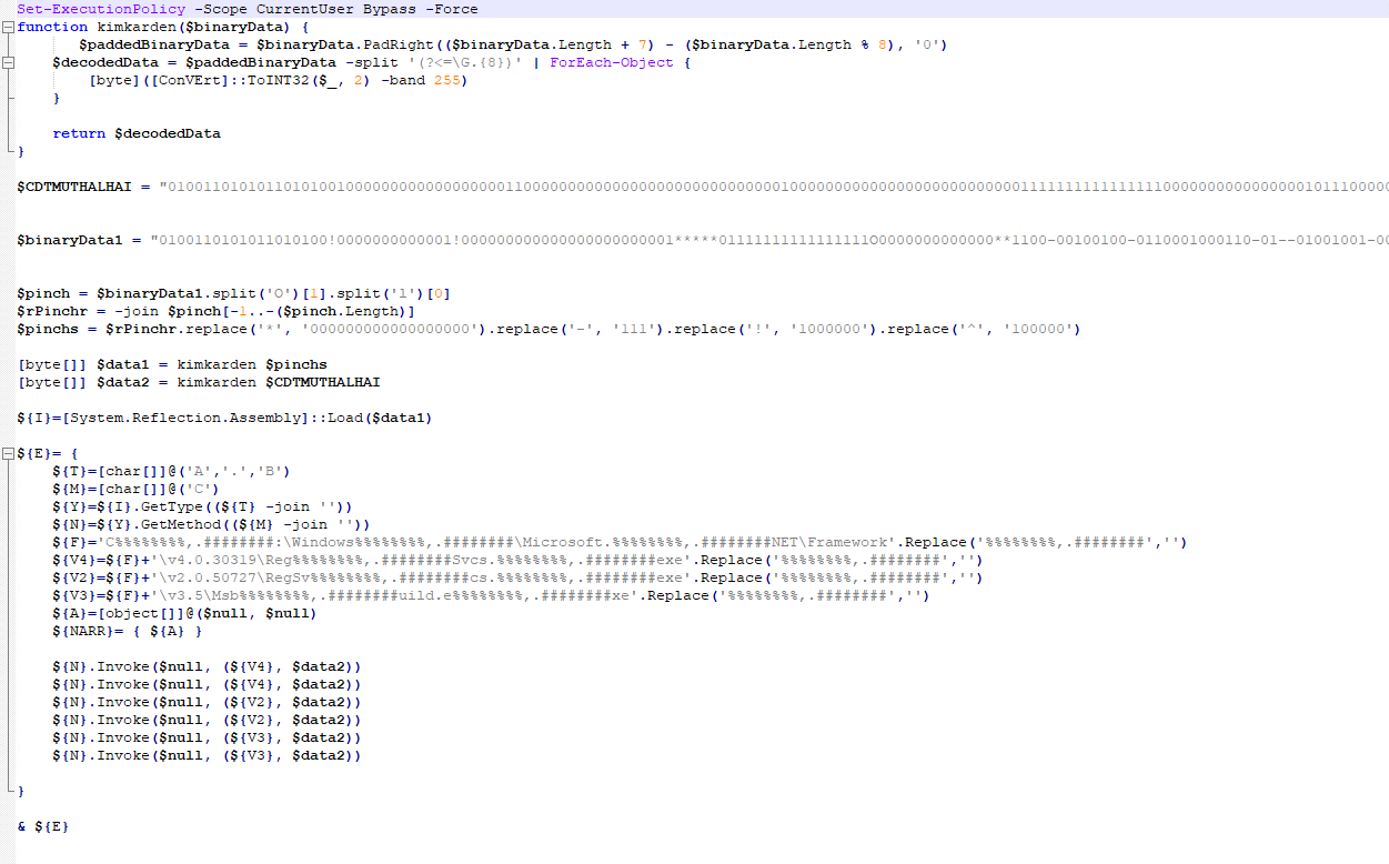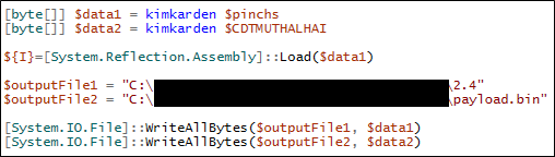 To get the binaries, knowing how the algorithm works is unnecessary. I added a few lines of code right after $data1 is loaded into the ${I} variable. Two output file locations and WriteAllBytes() functions. This ensures the two binaries run through the kimkarden function, and then I can just write them to a file. I also commented out the Invoke() functions (you can also just comment out the ${E} call at the end). $data1 is the DLL helper file, and the other payload, denoted by $CDTMUTHALHAI, is the AsyncRAT client.